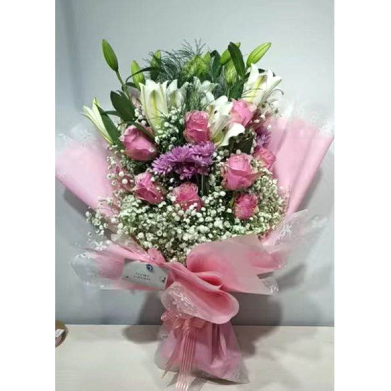 bu büyüleyici çiçek buketi, sadece bir bitki topluluğu değil, aynı zamanda duyguların en zarif şekilde dışa vurumu gibi görünüyor. Pembe ve beyazın hakim olduğu bu aranjman, zarafeti ve masumiyeti temsil eden bir sanat eseri niteliğinde. Buketin merkezinde yer alan pembe güller, sevginin, minnettarlığın ve hayranlığın en klasik sembolleridir. Güllerin yumuşak tonu, hem romantik bir jesti hem de derin bir dostluğu simgeleyerek çok yönlü bir anlam taşıyor.
